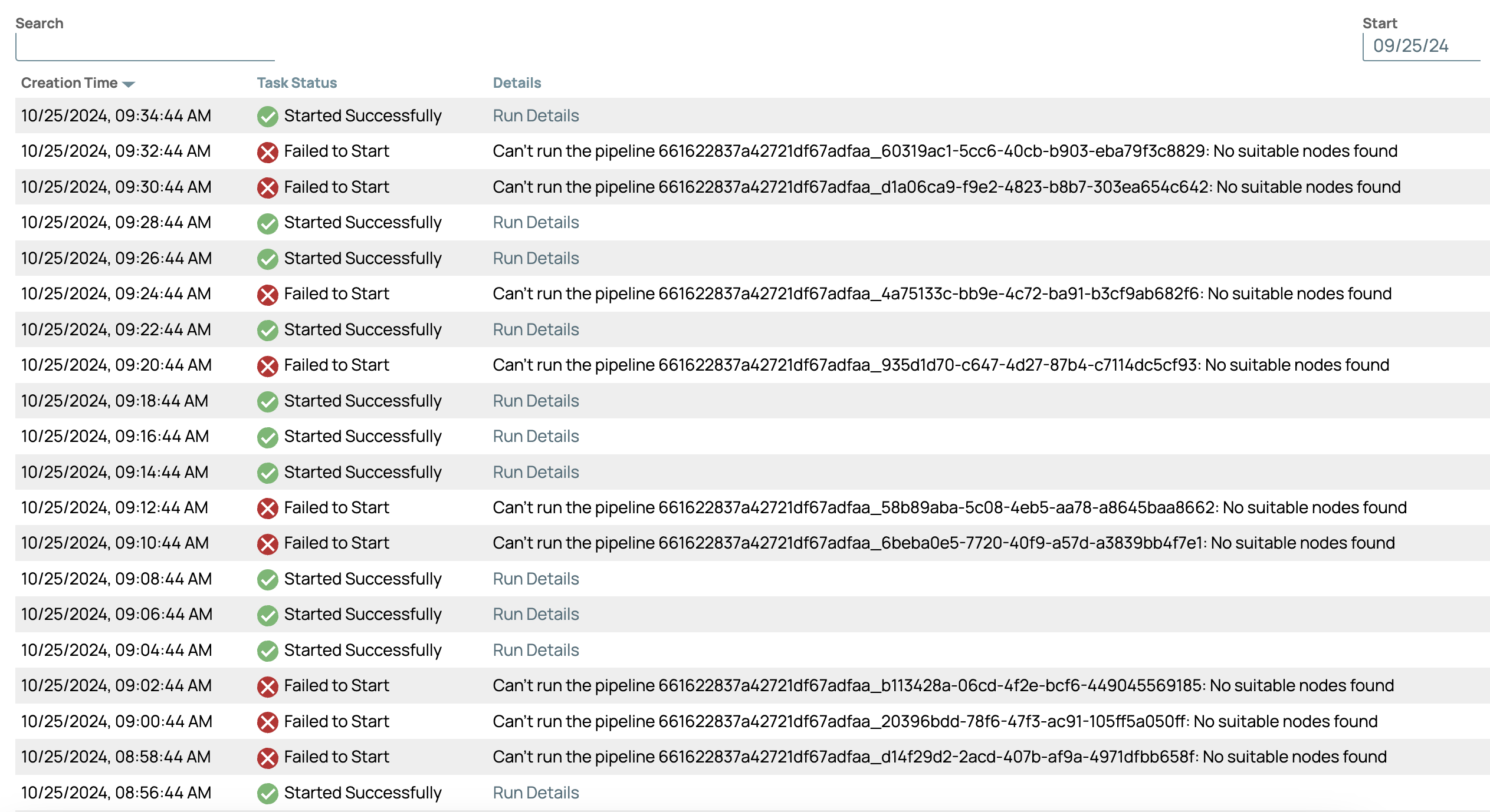 - Not started: Indicates a delayed execution that might still run. Details provides the time the task is waiting for resources to run the pipeline.