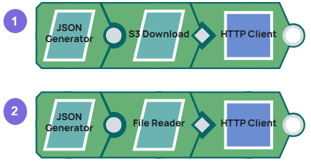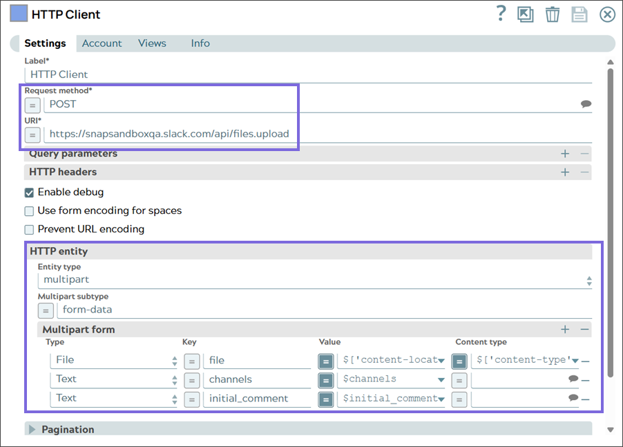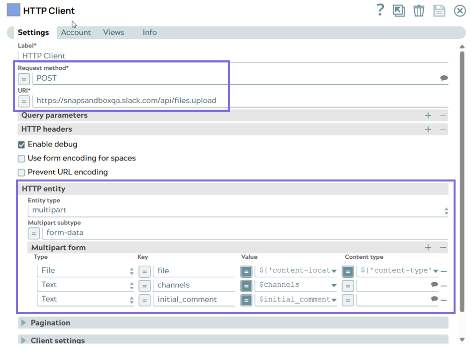 This example demonstrates two different methods of uploading files from external file systems using the HTTP Client Snap. The first pipeline reads a file from an S3 bucket and uploads it to Slack channel using the Slack API. The second pipeline uploads a file from the WASB (Windows Azure Storage Blob) location and sends it to the same Slack channel using the Slack API.