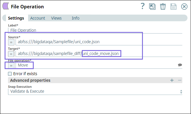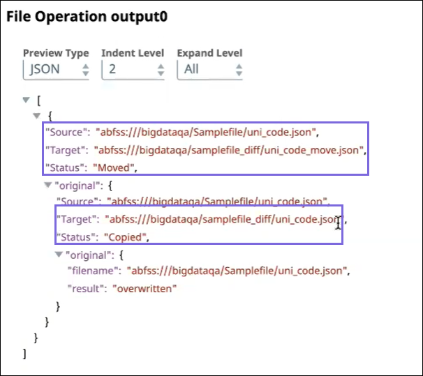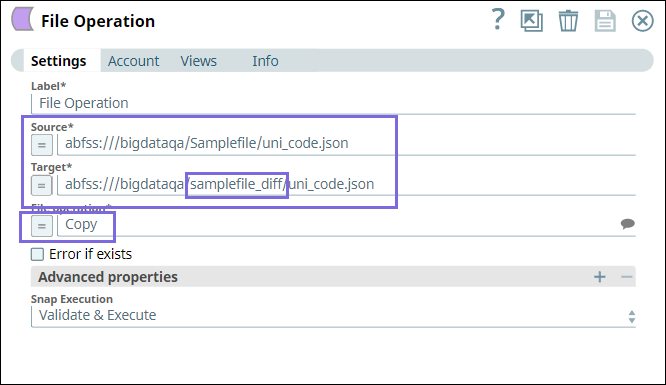 Snap to copy the sample file from abfss:///bigdataqa/Samplefile/ to
