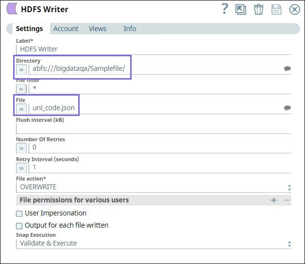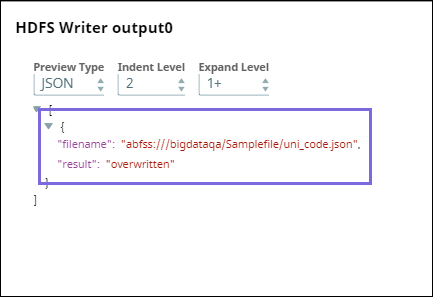 Next, we format the data using the JSON Formatter Snap and then, use the HDFS Writer Snap to write the sample file (that