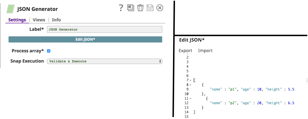 To replace this metadata, the JSON Generator Snap is used to generate a document with the data for name, age, and