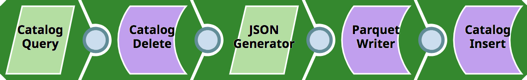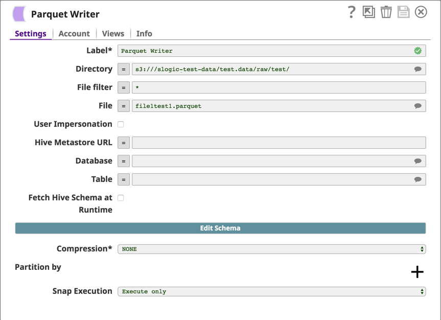 The JSON Snap passes the document data to the Parquet Writer, which writes the JSON document to a