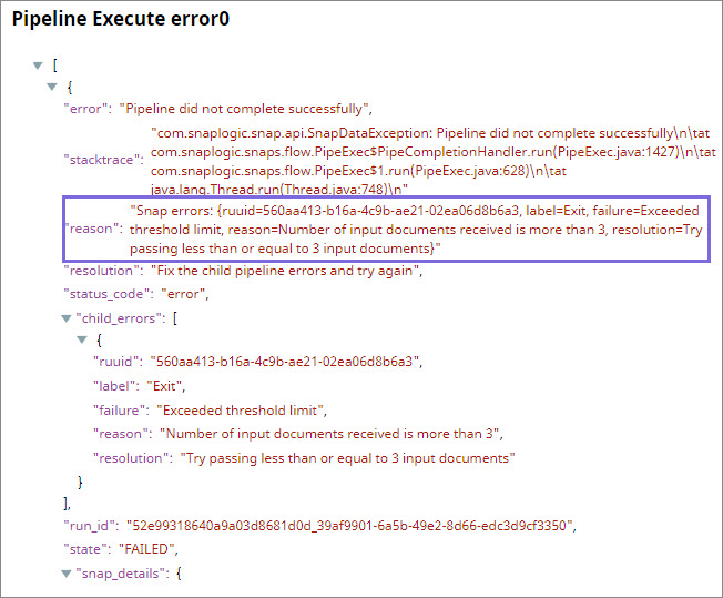 - The PipeLine Execute Snap sends all seven documents together to the child Pipeline for processing.