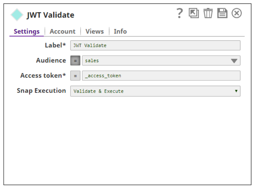 The pipeline below shows a standalone JWT Validate Snap (it contains a hardcoded token for demo purposes).