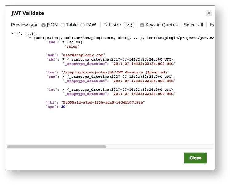 The preview shows the output when a JWT has been successfully validated and the token has been decoded.