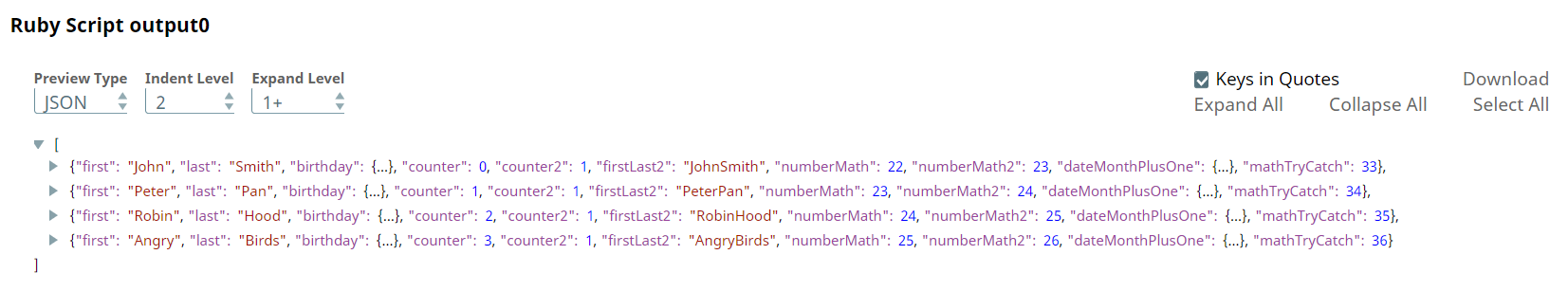 The following pipeline demonstrates how the Script Snap executes in all three supported languages. This pipeline uses a simple JSON file with First Name, Last Name, and Birthday.