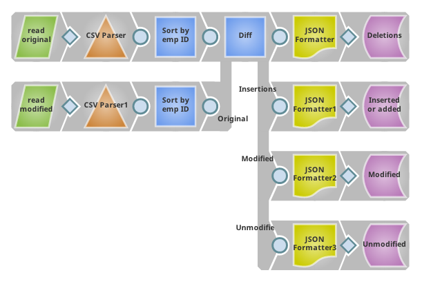 This example pipeline reads two files, an original CSV and a modified version. The modified version includes changes to existing rows, deleted rows and added rows. It creates four different output files based on the diff conditions.