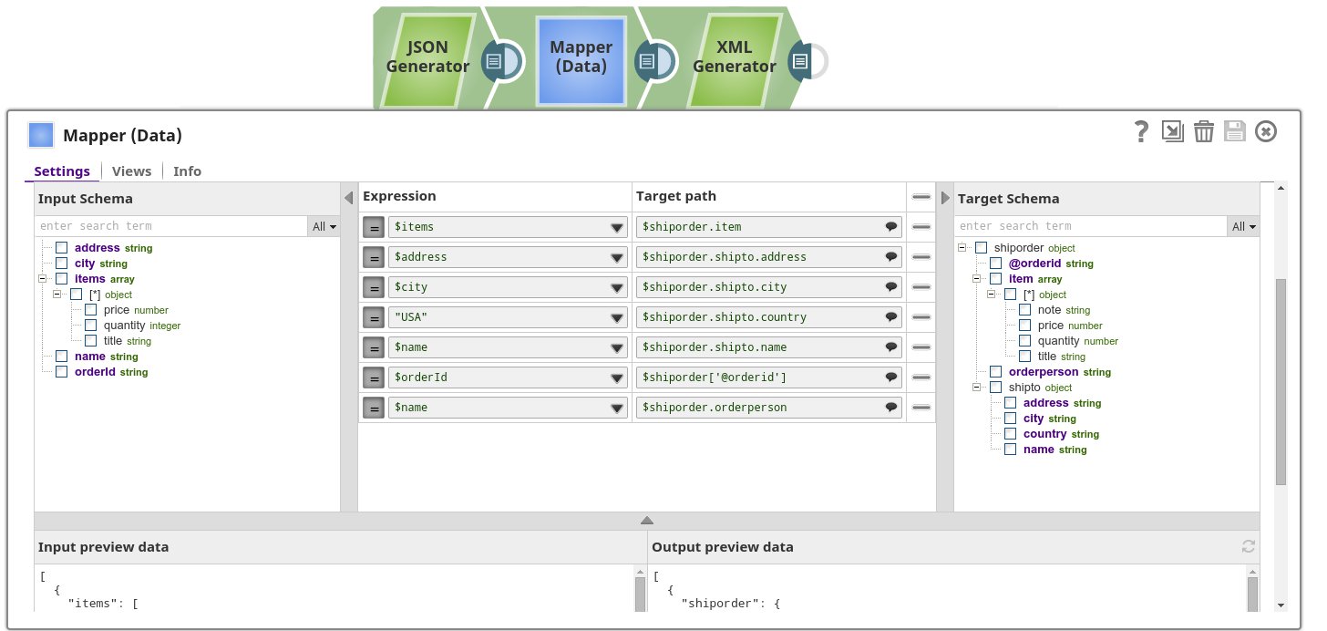 Here we map the items to the item list on the target. Further we map the city, address, country and name to the shipTo object on the target and then finally we map the name against orderperson and orderId against @orderId on the target. The @ indicates we map against an XML attribute.