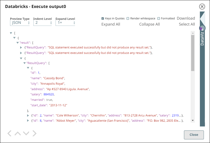 The Snap upon successful validation displays the output in the preview pane as follows. This output contains the SQL statement we passed and the respective result of execution.