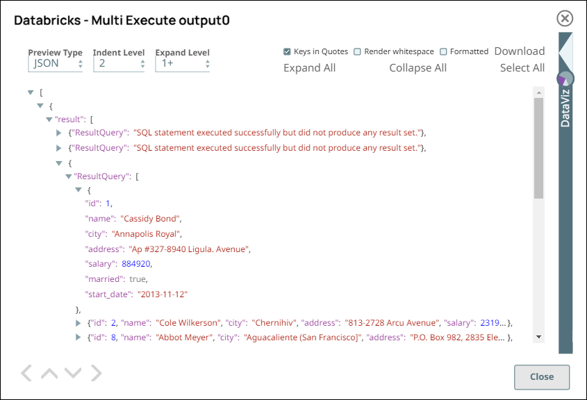 The Snap upon successful validation displays the output in the preview pane as follows. This output contains the SQL statement we passed and the respective result of execution.