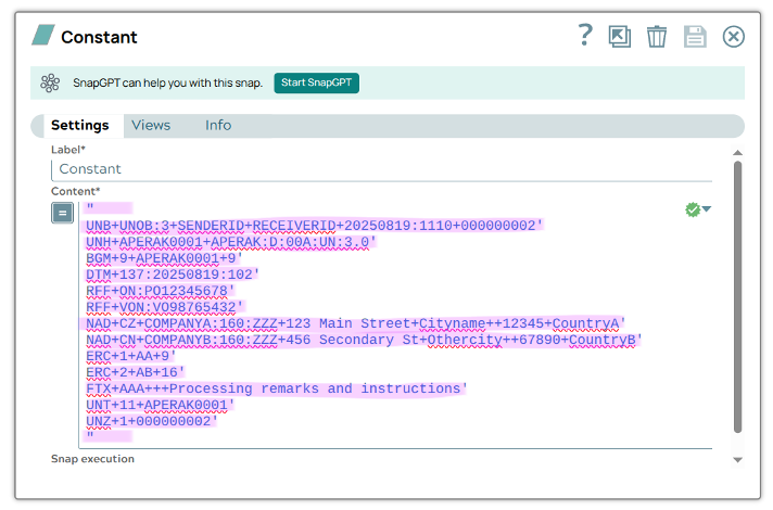 Use a Constant Snap to provide the EDIFACT