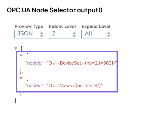 The following example pipeline demonstrates how to select multiple nodes from an OPC UA server. It uses the Node IDs to identify and retrieve data from designated nodes in the OPC UA namespace.