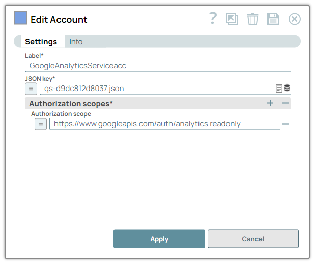 | JSON Key | String/Expression | Required. Specify the JSON key created for the service