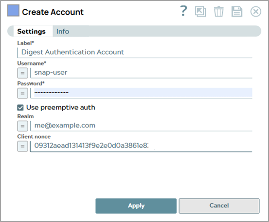 You can use this account type to connect the HTTP Client Snap with data sources that use the Digest Authentication account.