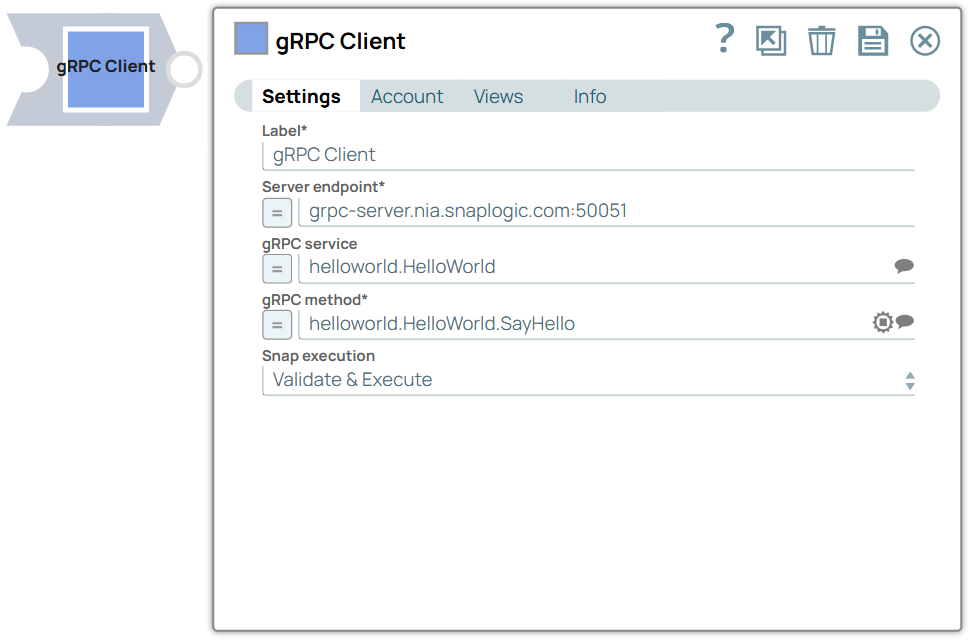 | Label | String | Required. Specify a unique name for the Snap. Modify this to be more appropriate, especially if more than one of the same Snaps is in the pipeline. Default value: gRPC Client Example: gRPC Client |