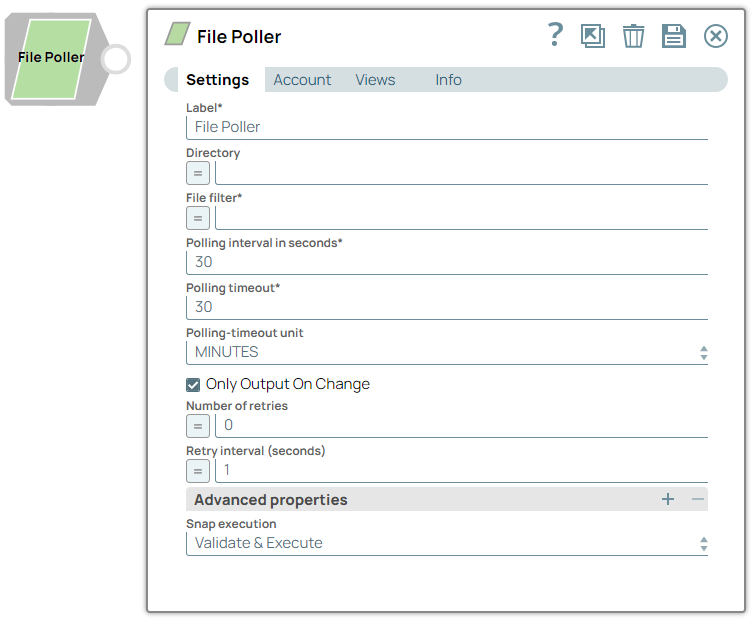 | Label | String | Required. Specify a unique name for the Snap. Modify this to be more appropriate, especially if more than one of the same Snaps is in the pipeline. Default value: File Poller Example: File Poller |