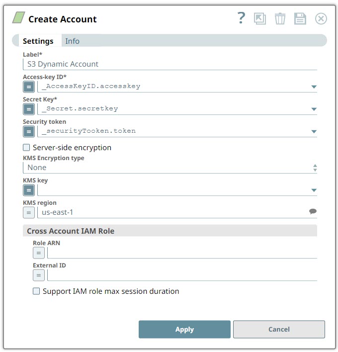 | Security Token | Dropdown list/Expression | The Security token part of AWS Security Token Service (STS) credentials. Default value: None. Example: XZlkdf129LONmn65n= |