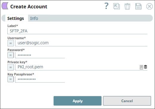 Use this account type to connect Binary Snaps with data sources that use Two-Factor Auth accounts. This account supports two factor authentication (2FA) for Security File Transfer Protocol (SFTP) to access SFTP. It uses two separate security layers of verification to grant access that include the Basic Auth (username/password) and the SSH Key (username/private key) methods.