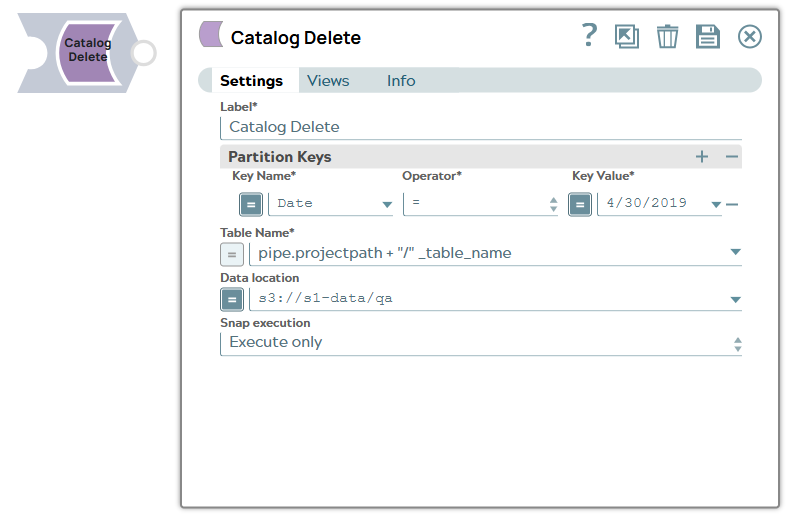 The Catalog Delete Snap enables you to delete the partitions within a specific Tables in the SnapLogic Data Catalog.