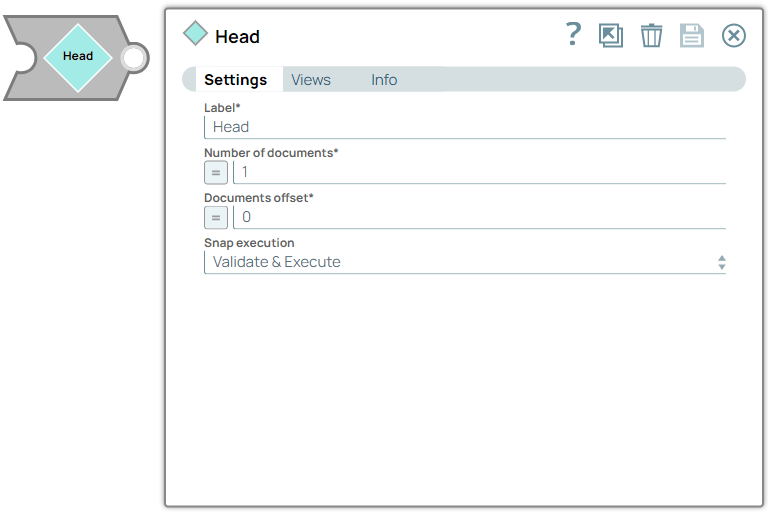 | Label | String | Required. Specify a unique name for the Snap. Modify this to be more appropriate, especially if more than one of the same Snaps is in the pipeline. Default value: Head Example: Head |