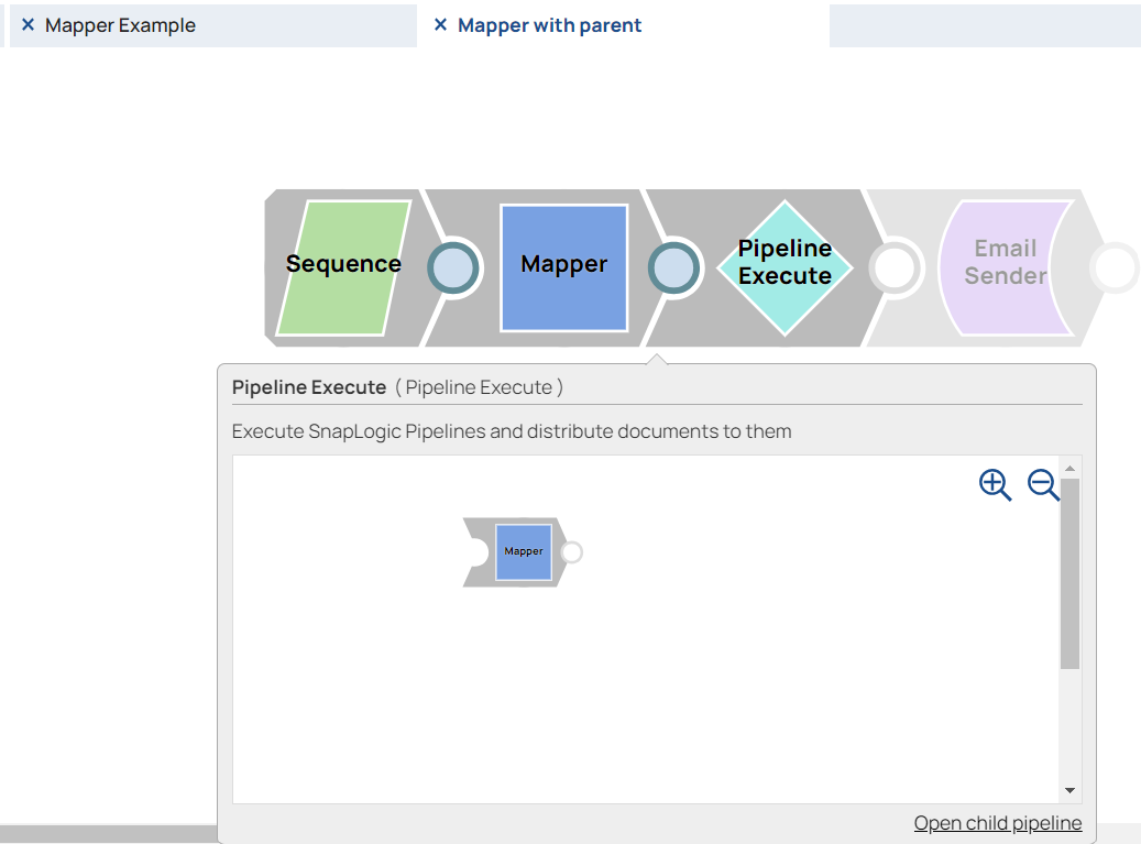 In this example, the document in this child Pipeline is sent to the parent Pipeline through output1 of the child pipeline. Any unconnected output view is returned to the parent Pipeline. You can use any Snap that completes execution in this way.