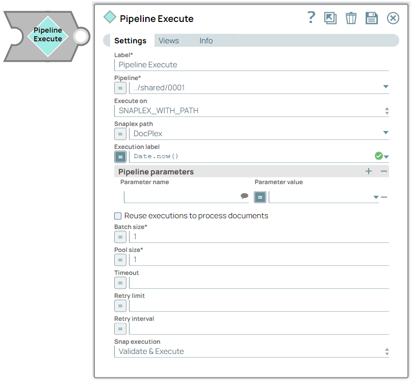 | Label | String | Required. Specify a unique name for the Snap. Modify this to be more appropriate, especially if more than one of the same Snaps is in the pipeline. Default value: Pipeline Execute Example: ExecuteCustomerUpdate Pipeline |