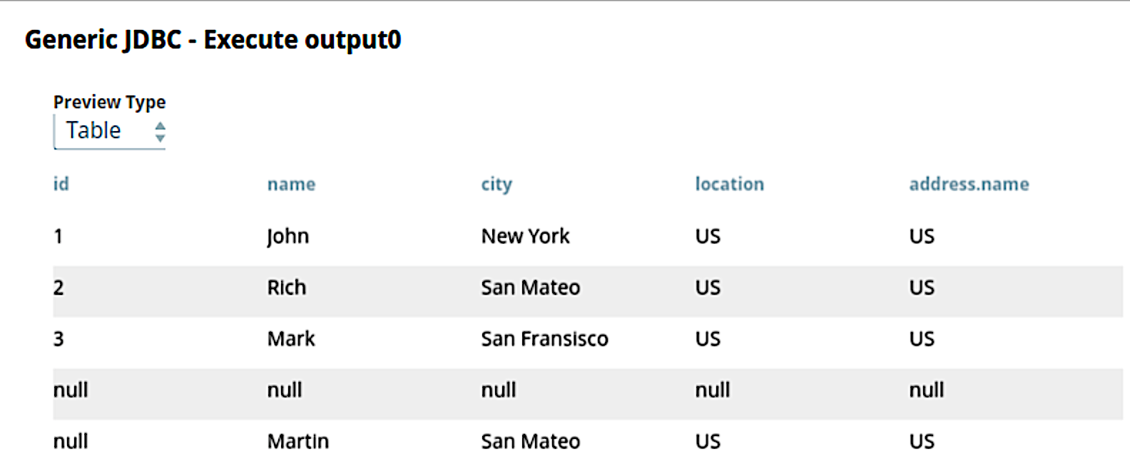 The Generic JDBC - Execute Snap's output should reflect the correct query result containing all the six fields, as shown in the image below: