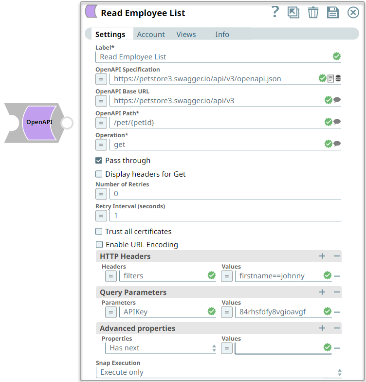 | Label | String | Required. Specify a unique name for the Snap. Modify this to be more appropriate, especially if more than one of the same Snaps is in the pipeline. Default value: OpenAPI Example: Read Employee List |