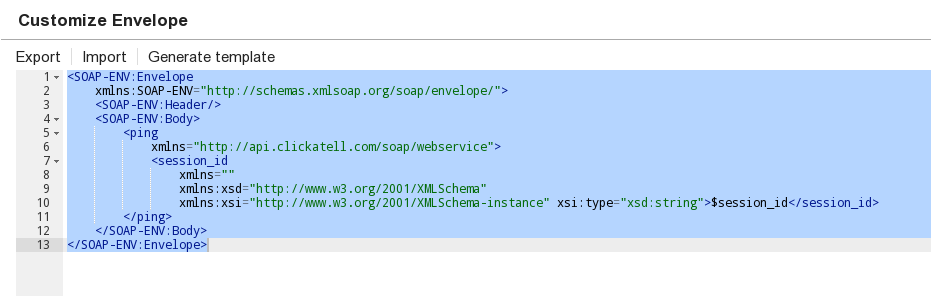 The envelope will be stored in the Snap after clicking OK. Further, the envelope can be exported to SnapLogic's file system using the export action or be imported from there using the import action. The Generate template action will regenerate the template, but the content of the editor must be removed prior to that. The envelope can be customized to meet specific endpoint needs. The Snap is fully configured and executable once the envelope is finalized.