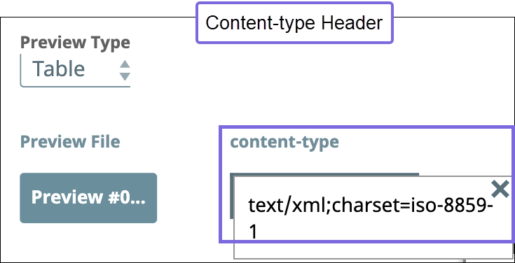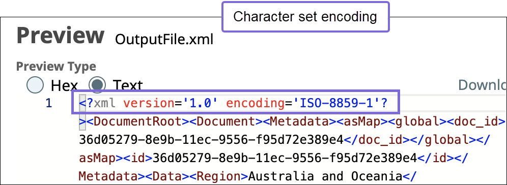 | Output Character Set | String/Expression/ Suggestion | Required. Specify or select the character set encoding for the output.   Default value: UTF-8Example: ISO860 |