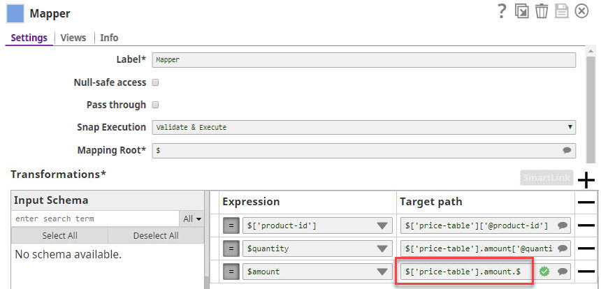 | Default value for substitution | String | This value will be used for substitution for the leaf elements which are not objects and/or not enclosed in an array. If nothing is specified and Use default value for substitution is selected, an empty string will be used for substitution. |