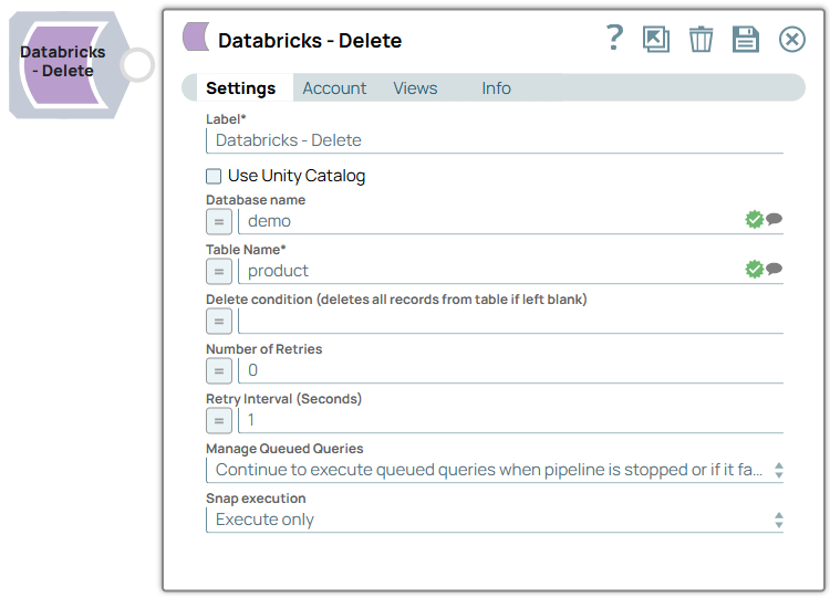 | Label | String | Required. Specify a unique name for the Snap. Modify this to be more appropriate, especially if more than one of the same Snaps is in the pipeline. Default value: Databricks - Delete Example: Db_Del_Duplicates |