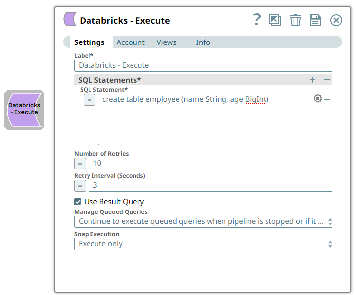 | Label | String | Required. Specify a unique name for the Snap. Modify this to be more appropriate, especially if more than one of the same Snaps is in the pipeline. Default value: Databricks - Execute Example: Db_MultiQuery |