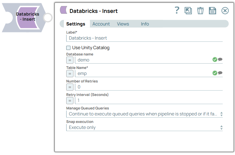 | Label | String | Required. Specify a unique name for the Snap. Modify this to be more appropriate, especially if more than one of the same Snaps is in the pipeline. Default value: Databricks - Insert Example: Db_Insert_Customer |