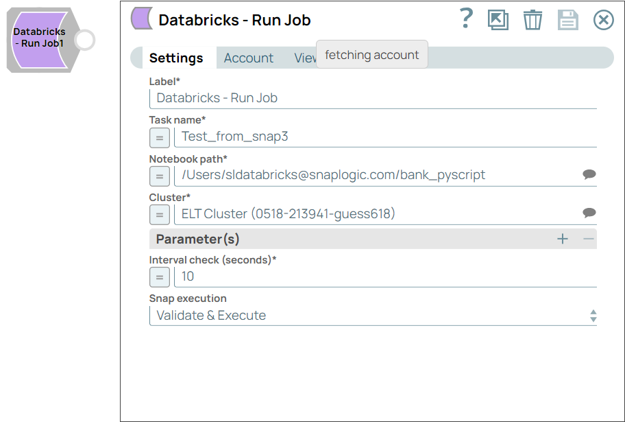 | Label | String | Required. Specify a unique name for the Snap. Modify this to be more appropriate, especially if more than one of the same Snaps is in the pipeline. Default value: Databricks - Run Job Example: Run Job |