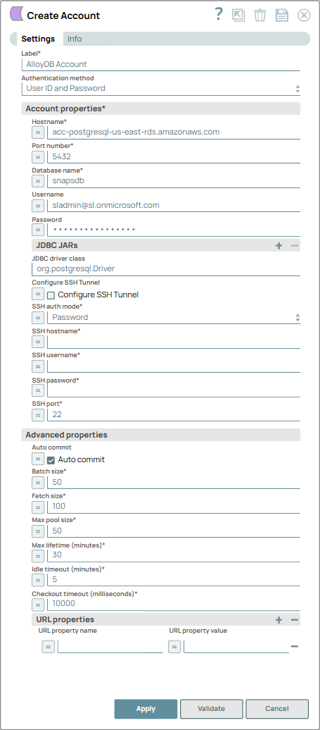 | Account properties | Account configuration to establish a connection to the PostgreSQL database. | |