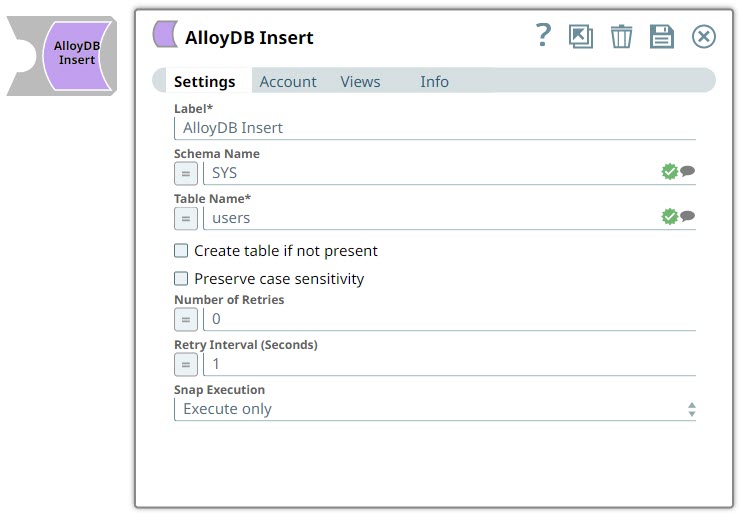 | Label | String | Required. Specify a unique name for the Snap. Modify this to be more appropriate, especially if more than one of the same Snaps is in the pipeline. Default value: AlloyDB Insert Example: AlloyDB Insert |