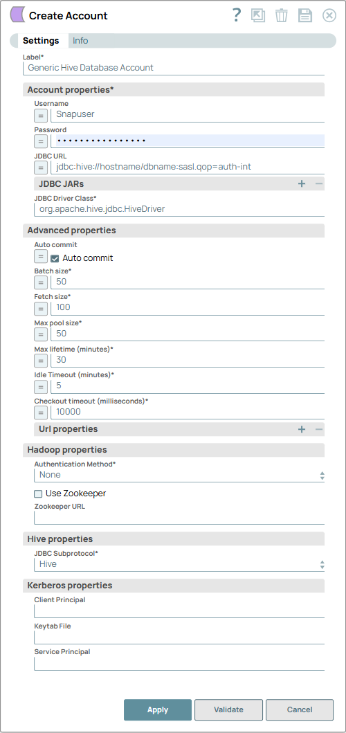 You can use this account type to connect Hive Snaps with data sources that use Generic Hive Database account.